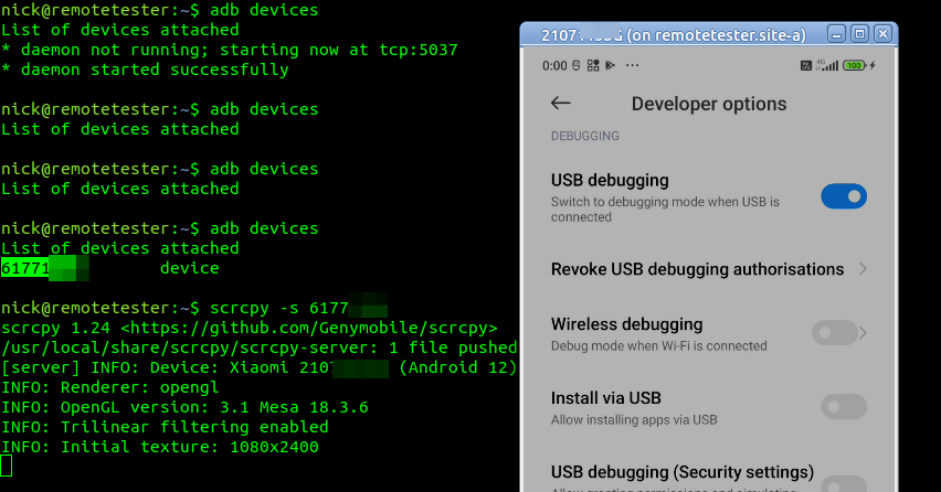 Now we can plug in each of the remote phones we want to use for testing and run the command “adb devices” which should list the phones with connected to the machine with ADB enabled:
