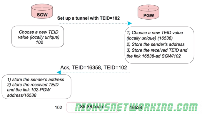 The process will start with the S-GW sending the P-GW a GTP-C tunnel establishment request and include the TEID the S-GW has allocated for it’s end of the tunnel (using TEID 102 in this example), sent from the S-GW to the P-GW.