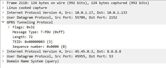 Like in most tunneling / encapsulation protocols we’ve got the original network / protocol stack of IPv4 and UDP, and a payload of a GTP packet.