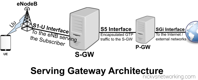 As we covered in the last post, the Packet Gateway (P-GW) handles decapsulating and encapsulating this traffic into GTP from external networks, and vise-versa. The Packet Gateway sends the traffic onto a Serving Gateway, that forwards the GTP-U traffic onto the eNodeB serving the user.