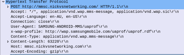 The HTTP GET is pretty normal, there’s the usual MMS headers we talked about in the last post, and we just GET the path provided by the MMSc in the WAP PUSH.