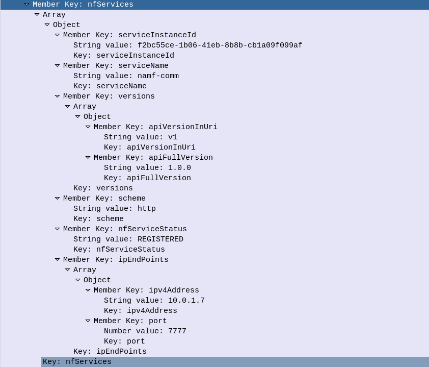 nfService – This is a list of JSON objects, detailing the services offered by the NF, such as the service names it is offering, version of the service, IDs of the service instances and IP Endpoints for requests to be sent to.