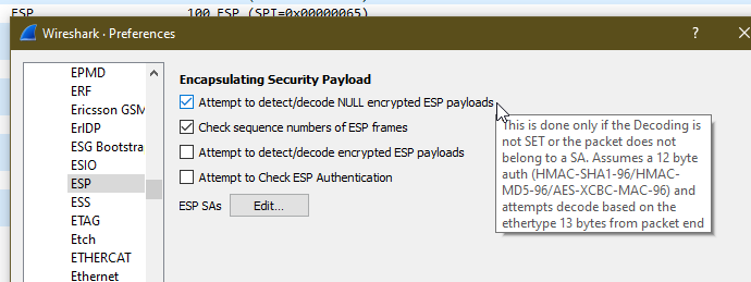 In our case we’ll tick the “Attempt to detect/decode NULL encrypted ESP payloads” box and close the box by clicking OK button.