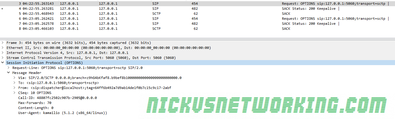 So that’s multi-homed SCTP in action – While a lot of work has historically been done with LACP for aggregating multiple NICs together, and VRRP for ensuring a host is alive, SCTP handles this in a clean and efficient way.