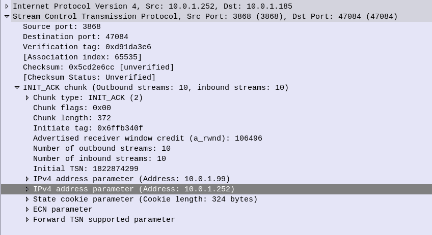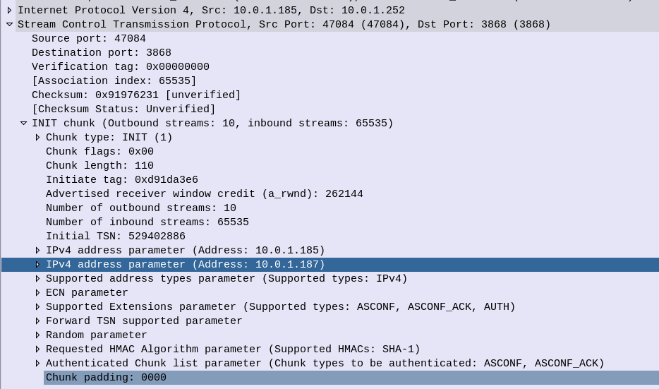In the above screenshot we can see the two IPs for SCTP to use, the primary IP is the first one (10.0.1.185) and also the from IP, and there is just one additional IP (10.0.1.187) although there could be more.