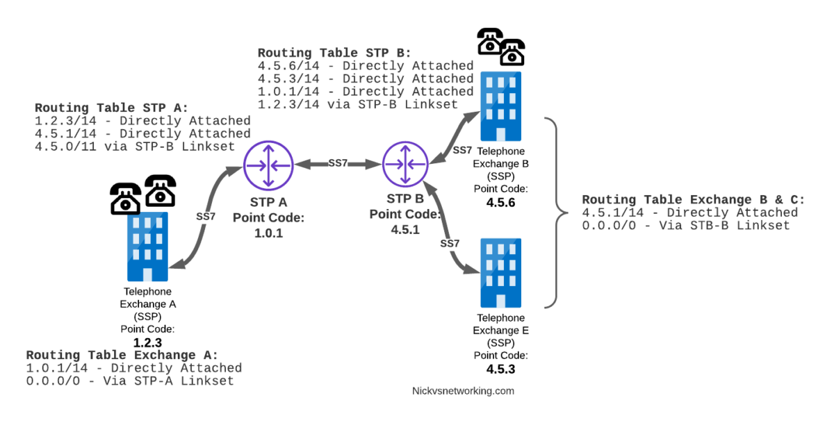 STPs don’t require a direct connection (Linkset) from the Originating Point Code straight to the Destination Point Code. Just like every IP router doesn’t need a direct connection to ever other network. By setting up a routing table of Point Codes and Linksets as the “next-hop”, we can reach Destination Point Codes we don’t have a direct Linkset to by routing between STPs to reach the final Destination Point Code.