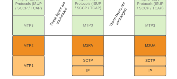When moving SS7 onto IP, the first layer of SS7 (MTP1) was dropped, as it primarily concerned the physical side of the network. MTP2 didn’t really fit onto an IP model, so a two options were introduced for transport of the MTP2 data, M2PA (Message Transfer Part 2 User Peer-to-Peer Adaptation Layer) and M2UA (MTP2 User Adaptation Layer) were introduced, which rides on top of SCTP. This means if you wanted an MTP2 layer over IP, you could use M2UA or M2TP.